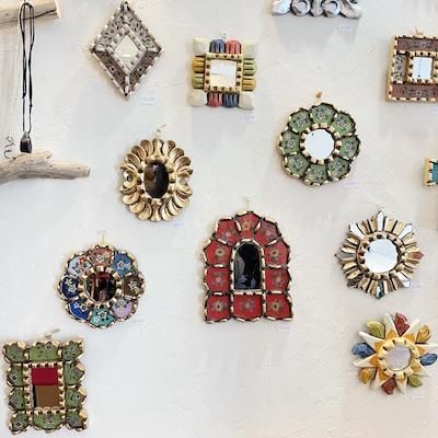【インテリアグッズ】飾り鏡 フラワー グリーン (ペルー製)